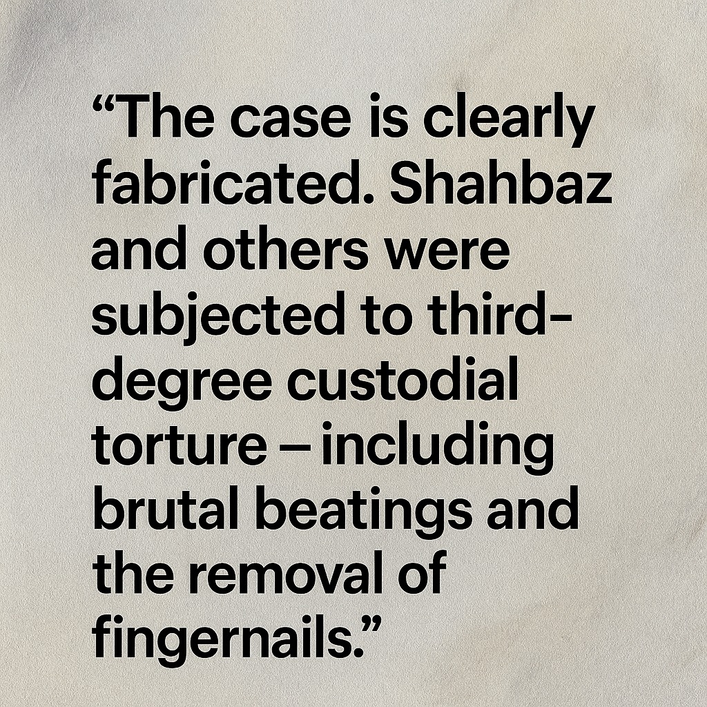 “The police neither filed a chargesheet nor produced any concrete evidence against my client. Shahbaz and others were subjected to third-degree torture in custody—including beatings and the removal of fingernails,” said Sabbaq, adding that a formal complaint regarding custodial torture is under judicial consideration.