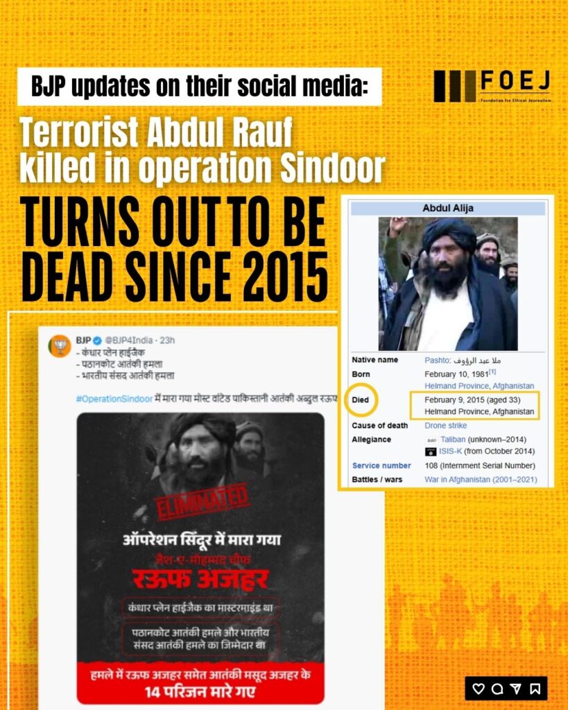 A wave of patriotic fervor and calls for retaliation against Pakistan swept through political and media circles in India. However, amid this atmosphere, a serious misinformation incident has come to light. The official Twitter handle of the Bharatiya Janata Party (BJP) claimed that a terrorist named Muhammad Rauf had been killed in India’s retaliatory strikes. It was later revealed that the individual named had actually died in 2015, rendering the claim factually incorrect.