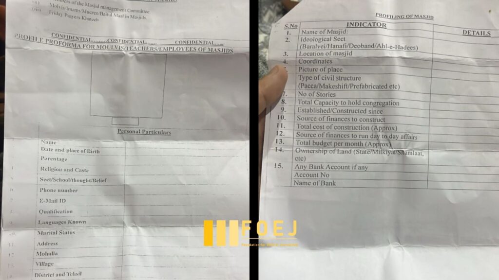 The Jammu and Kashmir police have introduced a large-scale exercise to gather the information on mosques in the area. The exercise includes collecting information on the mosque, the imams, the muezzins, and members of the management committees. The information is gathered through a four-page-long form including the section for the information including the personal details like social media profile, village, address, ideological sects. The form has been verified by the FoEJ Media.