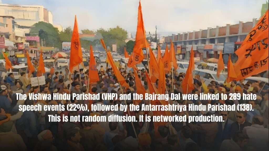 It is tempting to treat hate speech as the work of fringe actors. The report makes that comfort harder to sustain. It identifies more than 160 organisations and informal groups as organisers or co-organisers. The Vishwa Hindu Parishad (VHP) and the Bajrang Dal were linked to 289 hate speech events (22%), followed by the Antarrashtriya Hindu Parishad (138). This is not random diffusion. It is networked production.
