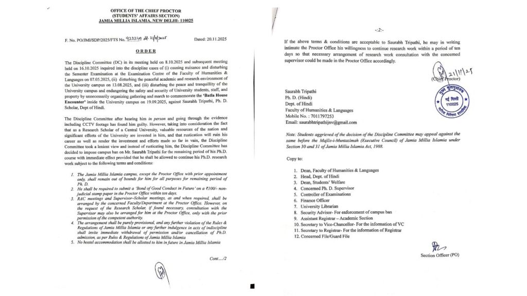 According to the proctorial notice, Saurabh allegedly disturbed “peace and tranquillity” on campus and was involved in creating a ruckus during an examination. However, the scholar has denied the allegations, calling them “fabricated and unsubstantiated.”