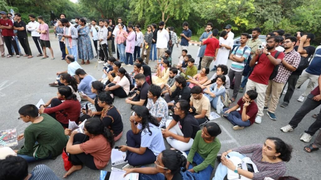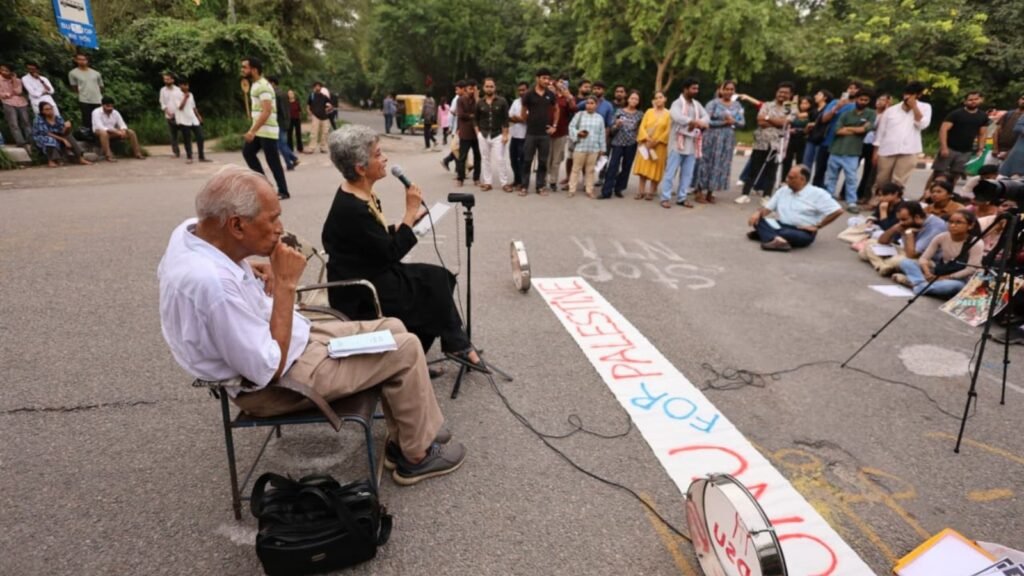In a powerful show of solidarity, close to 100 students gathered at the Sabarmati T-Point in Jawaharlal Nehru University (JNU) on Thursday evening for a public meeting organised by the student collective JNU for Palestine. The meeting aimed to express support for the Palestinian people’s right to national self-determination and to raise awareness against what the organisers termed as the “Israeli occupation, use of starvation as a weapon of subjugation, and the ongoing genocide in Gaza.”