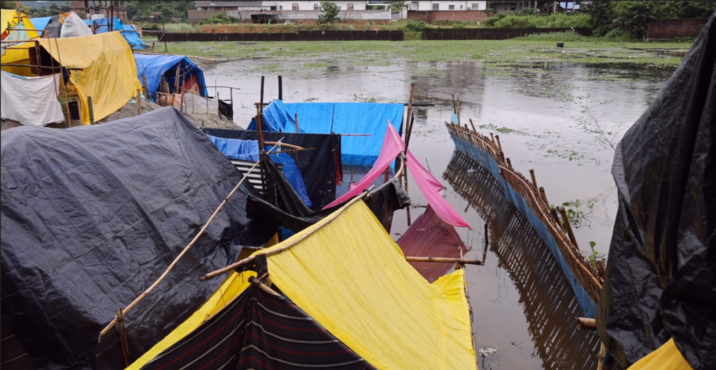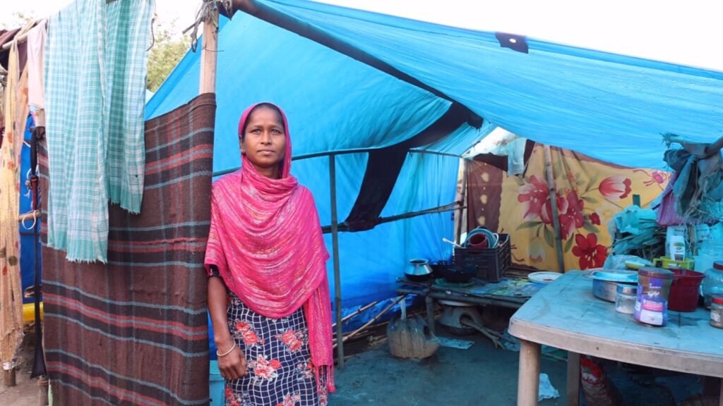 She now lives under a trampoline provided to her by “public” and eats whatever “public” gives to her and “When people don’t give me anything, I don’t eat—nothing happens.” she says . Bahatun also highlights the dire struggle for basic sanitation. The demolition has stripped families of everything, forcing them to pitch tarpaulins across barren land, scattered like dots with no access to washrooms, bathrooms, or drinking water. Women, in particular, bear the harshest burden of this absence, enduring the indignity and suffering that comes with having “no washroom.”