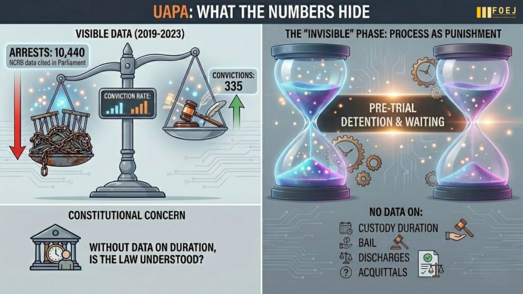 Over five years, 10,440 people were arrested under UAPA according to NCRB data cited by the Ministry of Home Affairs. During the same period, 335 convictions were recorded nationwide. These numbers were widely reported and quickly absorbed into public debate. Public discussion largely stopped there. Even official government figures confirm a conviction rate as low as ~2–4% under the UAPA.